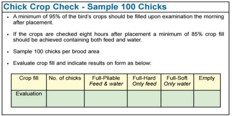 اگر جوجه ها در همان روز تولد در سالن جایگذاری شوند، باید چینه دان آن ها صبح روز بعد بررسی شود بررسی چینه دان یا (“Check Crop)”تا اطمینان حاصل شود که آب و دان کافی مصرف کرده اند. اگر جوجه ها یک روز بعد از تولد جایگذاری شوند، چینه دان آن ها باید ۸ ساعت پس از جایگذاری بررسی شود تا مصرف دان و آب ارزیابی شود. در این زمان، حداقل ۹۵٪ از چینه دان ها باید نرم و قابل انعطاف باشند که نشان میدهد جوجهها دان و آب را پیدا کردهاند. چینهدان سفت نشاندهنده آن است که جوجه ها آب کافی پیدا نکرده اند و دسترسی به آب باید فوراً بررسی شود. چینه دان های متورم و پر از مایع نشان می دهد که جوجه ها آب پیدا کرده اند ولی دان کافی دریافت نکرده اند، که در این حالت باید فوراً دسترسی و یکنواختی دان بررسی شود.